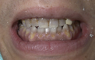 治療前 正面から見たとき、噛み合わせの悪さと表面の黄ばみが目立ちます。 |